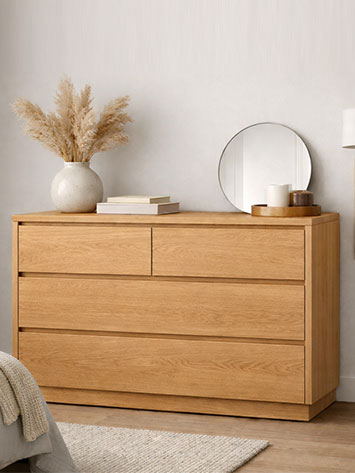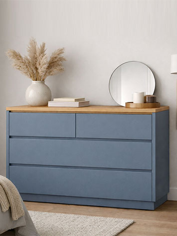Este modelo combina diseño y funcionalidad, ofreciendo amplios cajones que permiten organizar cómodamente ropa, textiles o cualquier elemento del dormitorio. Incluye patas de madera, que aportan ligereza visual al conjunto y facilitan la limpieza del suelo.